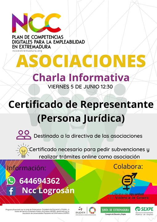 El plan d eCompetencias Digitales para la Empleabilidad en Extremadura a través del NCC de Logrosan, convoca el próximo Viernes 5 de Junio a las 12.30 horas , una charla informativa dirigida principalmente a Asociaciones para ayudar a la obtención del certificado de representante (Persona Jurídica).